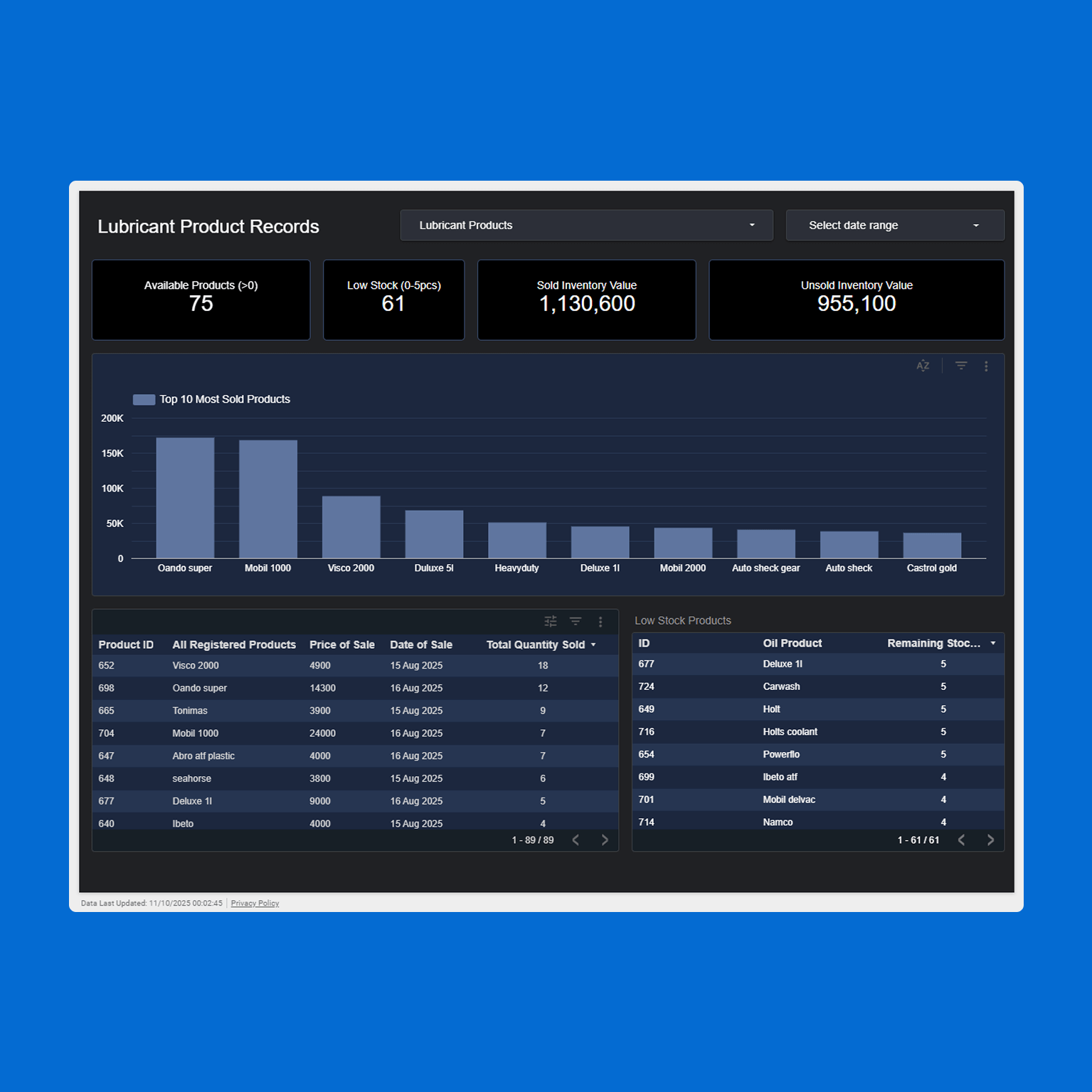 We built dynamic dashboards that help them visualize each pump's data using the pump ID and get records for any desired date range, and for monitoring and tracking lubricant inventory in real time. For low inventory, the system also sends daily email notifications to help the company keep track of low inventory in real-time.